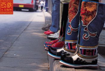 西藏高原地域遼闊,每個(gè)地區(qū)都有屬于自己的鞋子。藏族男女鞋,外觀雖然很像舞臺(tái)上古裝戲里穿的靴子,但用牛皮做底,底高二寸,腰高至小腿之上,鞋面用紅綠相間的毛呢裝飾,鞋腰也有線條、花紋,鞋幫用各色絲線或各色皮革、氆氌、金絲緞制成。人們能從一個(gè)人所穿的鞋子判斷出一個(gè)人的職業(yè)和社會(huì)階層。