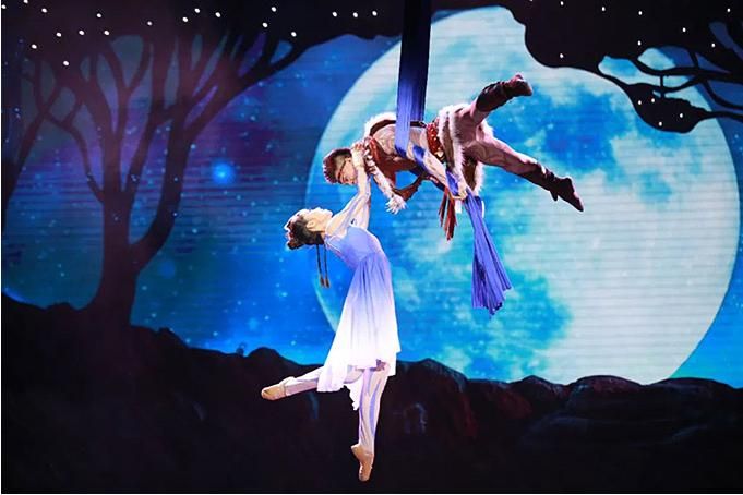 雜技藝術(shù)在劇場空間維度的呈現(xiàn),一是把身體作為一種最為本質(zhì)的符號材料進行直接表現(xiàn);二是通過與物體、音樂、舞蹈、燈光、唱詩等的排列組合,展示技藝的身體與物體、空間的關(guān)系,達到彰顯其生命意蘊與美學(xué)品質(zhì)的目的。劇中網(wǎng)吊、綢吊、轉(zhuǎn)動桿上技巧等項目非常炫技,展現(xiàn)了現(xiàn)代雜技的審美意境,詩與思在舞臺上相得益彰。綢吊極具浪漫色彩,承載著輪回與終極的生命哲理;智者的“唱詩”,凸顯了該劇的史詩特征,增加地域文化和遠古歷史的厚重感。
