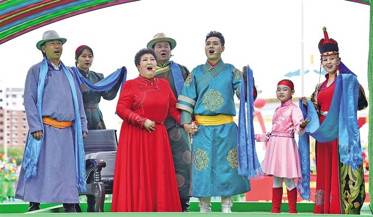 老一輩烏蘭牧騎藝術(shù)家德德瑪老師攜手幾代烏蘭牧騎演員放聲歌唱。