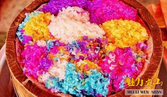 紅飯節(jié)的“紅飯”,是用一種叫紅飯葉的植物染成的。在節(jié)日的頭天,將紅飯葉洗凈放在鍋里加水煮成深紅色的汁,除去渣質(zhì),將泡好的糯米放入汁中浸泡三、四小時后控干,用甑子蒸熟即成紅飯。紅飯色澤鮮艷誘人,裝在碗里,猶如一朵初放的紅玫瑰,馨香四溢,沁人心脾,吃時沾上白糖或紅糖,味美可口。后來,紅飯逐漸變成了紅、黃、紫、黑、白等“彩色飯”。這些彩色食品,均是用紅飯葉、楊咪咪花、紫香藤、稻稈等植物的漿汁浸染而成,對人體無任何副作用。