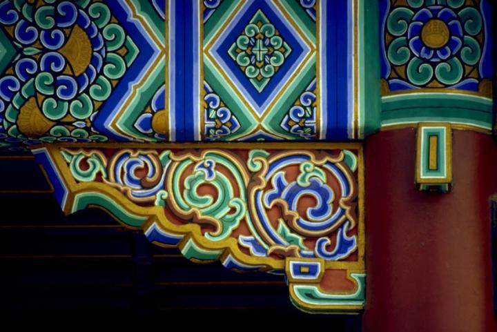 彩畫著色是一項(xiàng)關(guān)鍵的工序,不能有半點(diǎn)差錯。工匠們?yōu)椴煌伾O(shè)定了代號,一米色、二淡青、三香色、四硝紅、五粉紫、六洋綠、七佛青、八石黃、九紫色、十黑煙、十一紅等。將代號直接寫在地仗上,然后根據(jù)色號將各種色料對號入座,涂刷著色一、二遍,待干后再刷一遍光油罩光,以起保護(hù)作用。彩畫所用色料一般均為各色成品油漆。