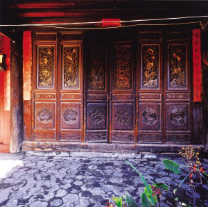 云南大理市綠桃村“三坊一照壁”民居堂屋六扇木門(mén)的雕刻。院內(nèi)廈廊和正房的格子門(mén),一般由6扇組成,每扇門(mén)又分隔成5塊木板,每塊木板都是透雕和浮雕相結(jié)合的木雕。分別雕刻著“雙鳳朝陽(yáng)、二龍搶寶、八仙過(guò)海、喜鵲登梅、漁樵耕讀、六合同春”的吉祥圖案,刀法嫻熟,輪廓清晰,形象生動(dòng),一個(gè)院落就是一個(gè)木雕藝術(shù)畫(huà)廊。此外,窗上有通透的花格,下部檻墻做成木質(zhì)裙板。