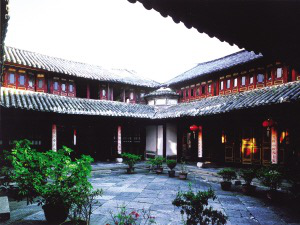 云南大理市喜州“四合五天井”院落。白族將一幢三開(kāi)間二層的房屋稱(chēng)為“一坊房子”。一坊房子是普通百姓最常見(jiàn)的住房,即底層三間一明兩暗,明間為堂屋,安設(shè)六扇花格門(mén)。兩側(cè)次間為臥室,設(shè)單扇門(mén)和格扇窗,前面有臺(tái)階和寬敞的廈廊。樓上三間敞通,一般不隔間,依房柱分區(qū)域,面對(duì)天井設(shè)格扇窗。中間明間靠后墻設(shè)神龕,里間當(dāng)書(shū)房,放書(shū)柜和書(shū)桌,人口多的也放床當(dāng)臥。