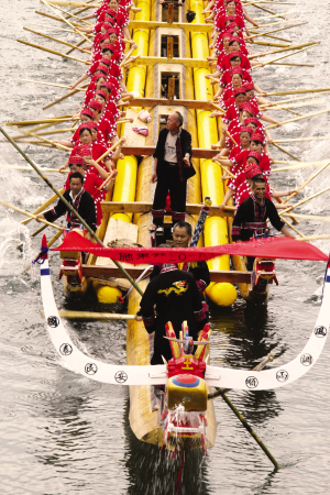 “苗族第一龍舟”全長77.8米,寬2.5米,整舟由一條主舟與兩條子舟組合而成,主舟居中,子舟為輔船,組裝在主舟左右兩側(cè),兩條子舟分別長58米。整船可承載槳手160人,舵手、鼓手、鑼手等共20人,總計(jì)180人。