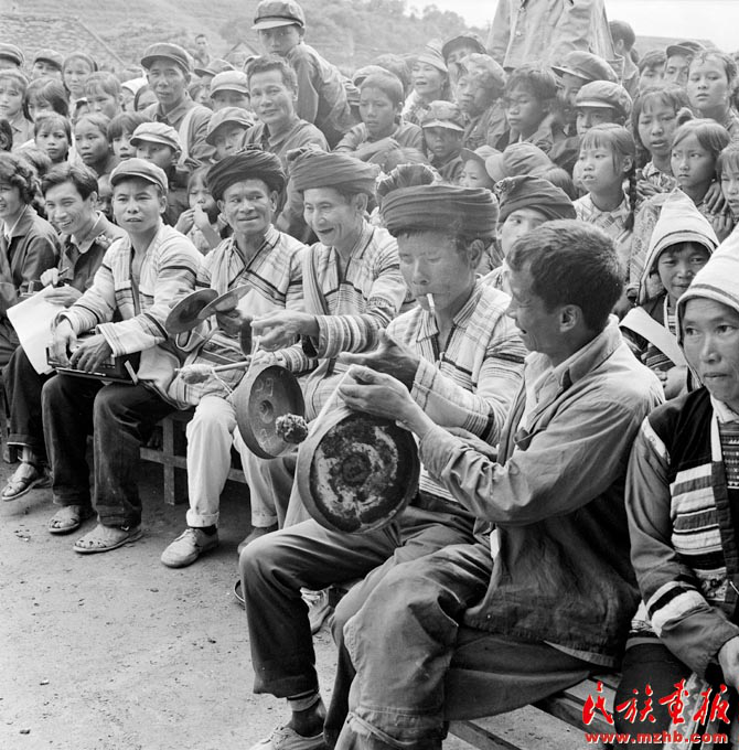 1979年,我國認(rèn)定基諾族為中國第56個(gè)民族,圖為基諾族群眾敲鑼打鼓歡慶的場(chǎng)景(中國民族圖片庫資料)