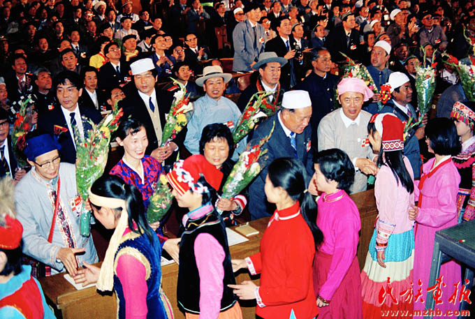 1988年4月25日至29日,首次全國民族團(tuán)結(jié)進(jìn)步表彰大會(huì)在北京舉行,圖為大會(huì)現(xiàn)場(chǎng).《民族畫報(bào)》1988年第8期