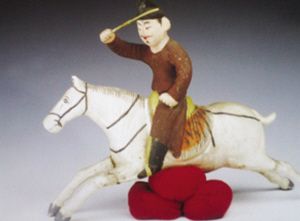 與揚州出土的打馬球銅鏡上的圖案相比,1972年,新疆考古工作者在吐魯番阿斯塔那187號墓發(fā)現(xiàn)的一尊打馬球俑,更具立體感。該泥俑高37厘米,蓄八字短須,身著圓領(lǐng)緊身絳色窄袖長袍,頭戴幞頭,腳穿黑色皮靴,足踩馬蹬,騎一匹白色大馬飛奔,手臂揮杖,作打馬球狀。
