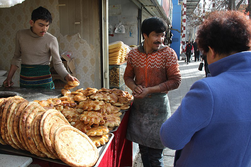 晚9點25分,烤馕店開始收攤。20歲的買麥提·沙烏提將賣剩的烤馕一一記數(shù),由22歲的阿吉拇提登記,然后將桌面和地下打掃干凈。掃帚頭已經(jīng)磨禿,但買麥提·沙烏提仍然掃得很認(rèn)真,不放過一點垃圾。清掃完,買麥提將屋里的爐子封好,并給爐上的鐵水壺加滿水。煤爐上是一小截?zé)焽?,但并未伸出房頂。明天一早,封好的煤爐將會打開,小屋里會有一段時間冒出濃煙。橋門社區(qū)年輕的女書記劉蕊對這股“每天在一定時間出現(xiàn)”的濃煙很不滿。她說,自己從臨夏到天津上大學(xué)時路過蘭州,當(dāng)時蘭州的空氣很不好。這幾年政府付出了極大的努力,去年11月小車單雙號限行一個月,全市公交車全部免費。蘭州天空終于見藍(lán)了,但烤馕攤里冒出的煙卻對蘭州的藍(lán)有影響。社區(qū)工作人員做了幾次工作,但至今沒有效果。