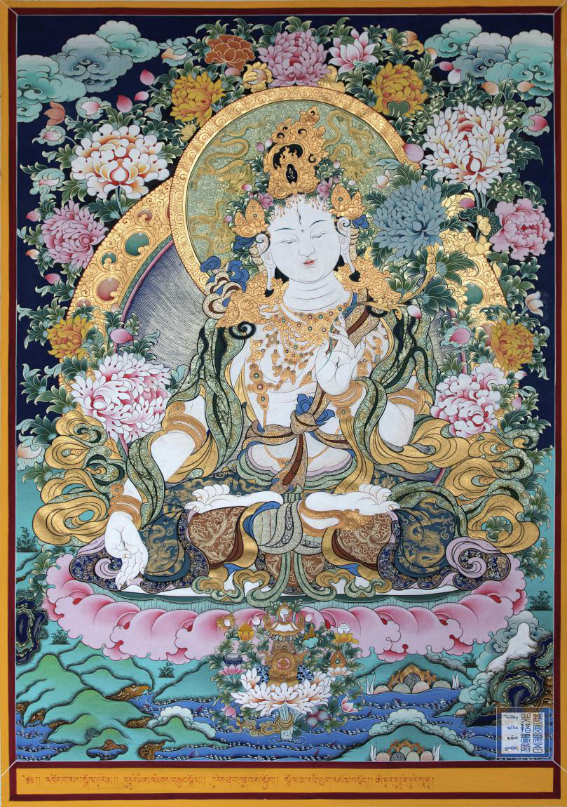 白度母,藏語稱“卓瑪嘎波”, 膚色潔白,玲瓏剔透,身放五光,溫靜微笑,相貌顯得青春年少,七只慧眼個個如菊花花瓣大小,這些眼象征她能觀照一切眾生。一面二臂,右手結施愿印,以示救助。左手拇指與無名指牽住白蓮花枝對著心間,花開至耳旁;美麗動人,乳房隆起;以白珍珠為主的各種寶貝分別作為頭飾、耳飾、項飾、胸飾、腰飾、手鐲、腳釧;佩戴鈴串、天物之花;上穿白絲,下著錦裙;秀發(fā)后束,頂髻飄逸;月亮靠背,結金剛跏跌危坐。