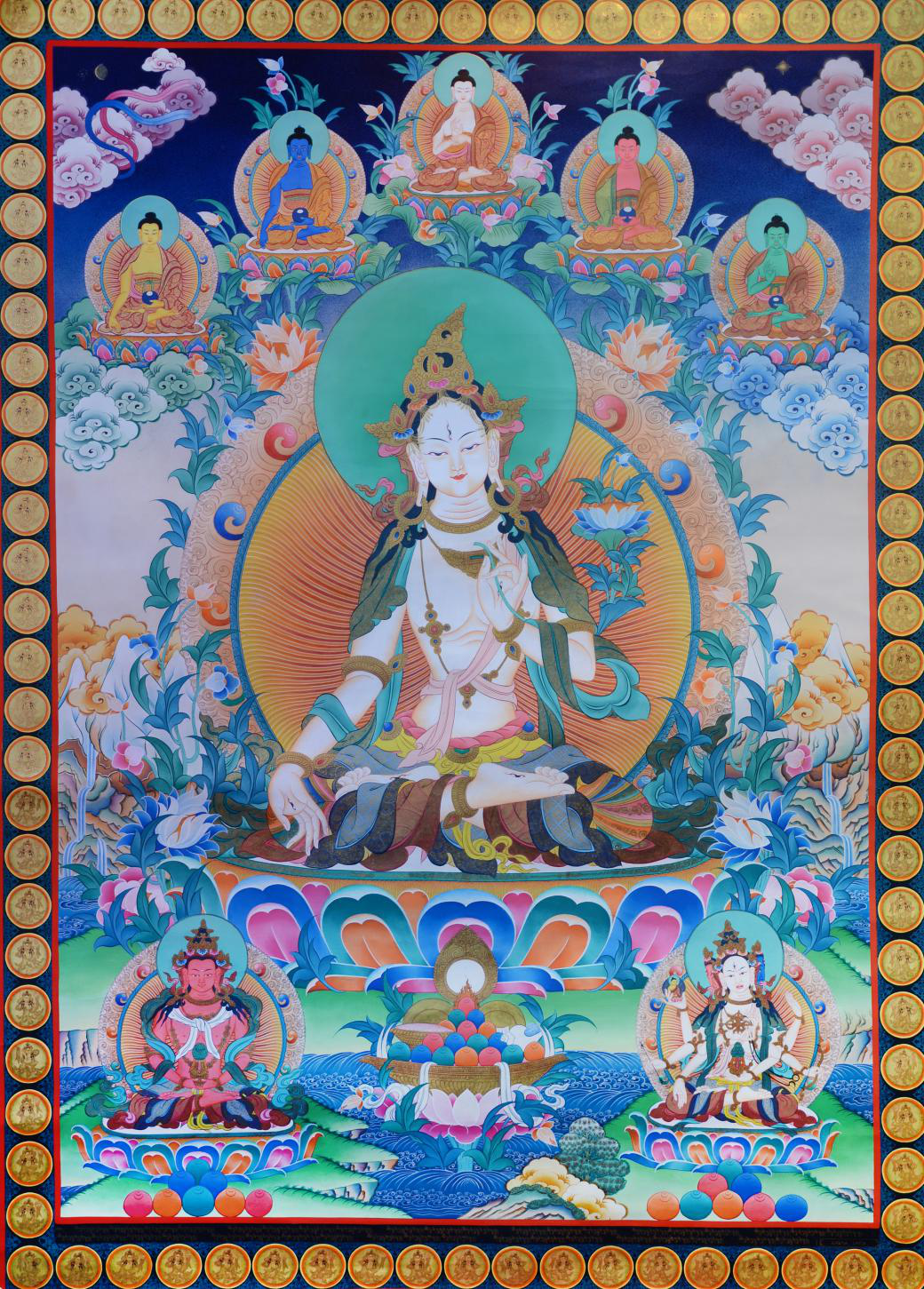 白度母(White Tara),藏音譯卓瑪嘎?tīng)柲?,又稱(chēng)為增壽救度佛母,是觀世音菩薩的化身。觀世音有32種應(yīng)化身,僅其中的度母化身就可以變化為21位救度母,白度母即為圣救度佛母的二十一尊化身之一。在藏傳密教中,綠度母與白度母是二十一尊度母之中流傳最廣的。而藏密又常以長(zhǎng)壽佛、白度母及尊勝佛母等三尊合稱(chēng)為:“長(zhǎng)壽三尊”。