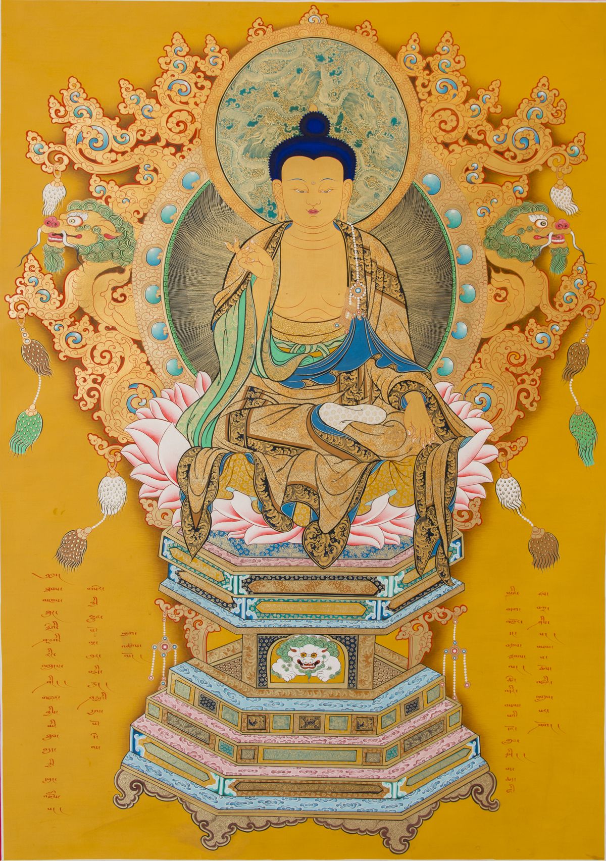 大日如來佛,又名比盧遮那佛,是佛的三身中的法身佛,是密宗最無上崇高的佛,是一切佛法的根本。亦是五方佛中的中方比盧遮那佛,居于世界中央位置。