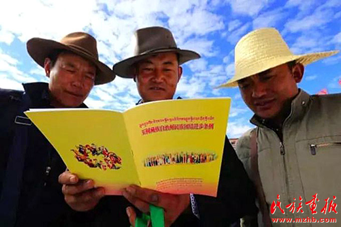 玉樹(shù)藏族群眾閱讀《玉樹(shù)藏族自治州民族團(tuán)結(jié)進(jìn)步條例》(中新社 供圖)