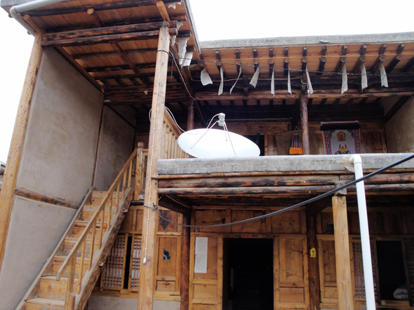 為改善狹小的寨內(nèi)空間,當?shù)鼐用窬藿硕幽窘Y(jié)構(gòu)樓房,和青海鄉(xiāng)村民居庭院寬敞的特點形成了反差。寨內(nèi)民居庭院多為四合院式,房屋為土木結(jié)構(gòu)平頂房,一般民居都有飛椽花藻之類。屋內(nèi)一般以木板作隔扇,室內(nèi)有護炕木板、護墻木板墻圍,且多雕花草于其上。房屋一般面闊三間,正面以木板隔墻并裝上木板條方格小花窗。佛堂設(shè)在二樓,佛堂所在的房屋一般都是上房,和佛堂不同向的兩邊廂房一般做臥室。院落中央一般都有豎掛經(jīng)幡的旗桿,還設(shè)有桑臺,具有明顯的藏式特點。