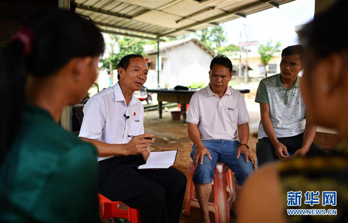 羊風極(左)在海南省白沙黎族自治縣打安鎮(zhèn)田表村收集群眾意見和建議