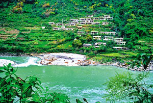 在怒江上游峽谷聚居的傈僳村寨都建在高山的半山上,其民居俗稱為“千腳落地房”。說“千腳落地”雖有些夸張,但也足以形象地說明峽谷溫?zé)岬臍夂蚝蜕礁咂露傅牡乩項(xiàng)l件。在雨季時(shí),“千腳”阻力最小,使山洪順利傾瀉而下,又很快干爽,免受潮氣。而且不需挖地動土,不必移石砌墻,對木料沒有過高要求,長短皆用,在生態(tài)脆弱的高山峽谷也算環(huán)保建筑。“千腳落地”是因建房時(shí)先在確定的屋基上依斜坡程度和住房面積打進(jìn)數(shù)十根到百余根木樁為基樁,以保證居室樓板的平正?;鶚洞蚝煤螅拿媪魩赘咧鳛檎麄€房屋的立柱外,在密集木樁所形成的平面上滿鋪竹篾編織的樓板,還有竹篾圍墻,所有結(jié)構(gòu)皆用竹篾綁扎。屋頂鋪苫草或蓋木片瓦,近幾年,已陸續(xù)換上了大塊的水泥波形瓦。房門開在山墻一側(cè),有廊道,可做曬臺,平時(shí)穿的衣服都搭在這兒,也是婦女做針線活的地方。隨著怒江峽谷的開發(fā)和新農(nóng)村建設(shè)的深入,通路的村寨將很快會改變面貌。