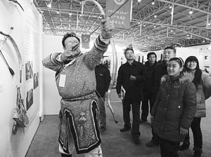 日前,在北京舉行的非遺生產(chǎn)性保護(hù)成果大展上,幾名觀眾圍攏在一個(gè)身材魁梧的錫伯族老人周圍,但見他身罩長(zhǎng)袍,足踏薄底靴,雙目圓睜,兩臂運(yùn)力搭弓上箭,儼然就是準(zhǔn)備步射的驍將。這位老人就是錫伯族傳統(tǒng)弓箭技藝傳承人伊春光,老漢手中的弓重近1公斤,是他親手制作的。