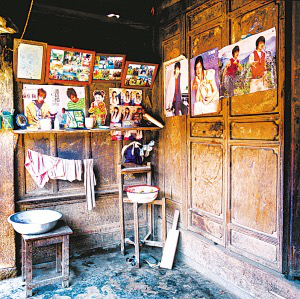 隴川縣戶撒鄉(xiāng)曼旦寨是阿昌族古老的村寨之一,明、清時(shí)期的老宅皆以楠木建造,數(shù)百年不朽、無蟲蛀。受漢族文化影響,傳統(tǒng)民居大都是土木石結(jié)構(gòu)的三合一照壁或四合院落。正房建在長(zhǎng)方石條加土方壘起的屋基上,屋基下為院壩,以三層石階上下。正房三開間,四排五柱,中柱起脊,形成雙斜面屋頂,上覆凹型青瓦。后墻和兩側(cè)山墻以土坯砌筑,外面不抹泥,左右是廂房或照壁。室內(nèi)隔墻均為木板,中間一間為堂屋,有一米多寬的吞口,六扇雕刻的木板門,平時(shí)只開中間兩扇。兩邊的檐柱頭有粗獷的木雕。吞口有走廊的作用,一般左側(cè)角設(shè)臉盆架以供洗漱,板壁上掛小鏡框以便梳妝,旁邊掛著家人的照片。有的擺著縫紉機(jī),有的放藤椅小憩。右側(cè)放臨時(shí)的農(nóng)具,掛衣服,板壁上貼著影視明星的招貼畫。堂屋正面板壁是通高的木雕佛龕,供奉佛像和傣文的經(jīng)文,龕楣上貼著三至四層掛錢,下面有燭臺(tái)、香爐。左側(cè)擺著電視機(jī)、熱水瓶、茶桌,板壁上掛著戶撒刀和手工編織的背兜,右側(cè)有專供老人休息的床或藤椅,也有的砌火塘,火塘的小土臺(tái)上放著炒菜的調(diào)料、火柴和照明燈具。