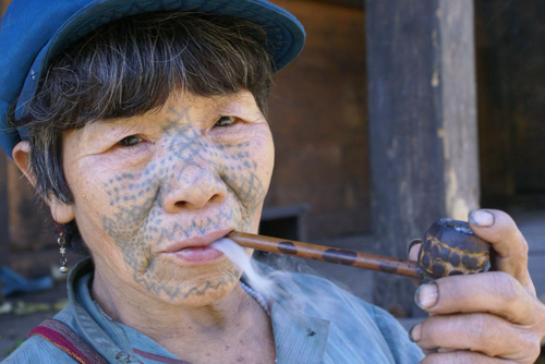 來自獨龍江上游的二鄉(xiāng)、一鄉(xiāng)的婦女則從額頭起,面紋布滿了整個臉部,僅僅是花紋圖案不一樣。有些老年婦女不但滿面紋,連頭發(fā)也剃光,只剩額前小小的一撮。據(jù)說,從不同的面紋圖案,當(dāng)?shù)厝艘谎劬湍芸闯鲞@個婦女居住的地方,是某個部落或民族的。