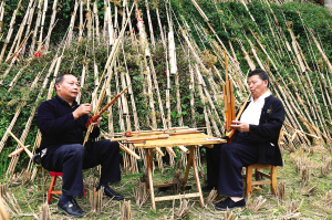 隨著日子的臨近,有些村寨的蘆笙手干脆包米包菜到莫師傅家守候和督促。大量訂戶的到來使莫師傅的工作室變得擁擠不堪。莫厭學(xué)、莫里學(xué)兩兄弟干脆把制作蘆笙的工作室搬到室外,把最近2個(gè)月來制作的1077把蘆笙也搬到室外逐一進(jìn)行檢修和校音。