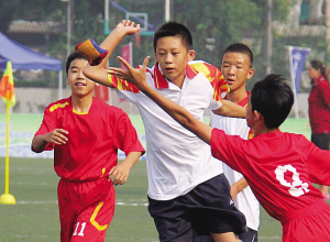 19日舉行的開(kāi)幕式文藝表演《鼓舞你我他》,特別突出了體育元素和民族元素的結(jié)合,1000余名來(lái)自北京市各行各業(yè)的非專(zhuān)業(yè)演員參與演出。(上圖為運(yùn)動(dòng)會(huì)開(kāi)幕式現(xiàn)場(chǎng);下圖為運(yùn)動(dòng)會(huì)綾球比賽現(xiàn)場(chǎng)。)