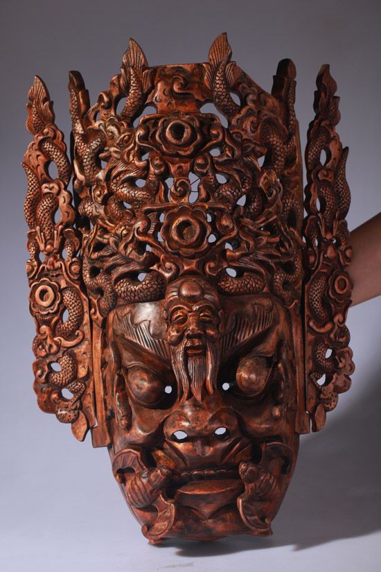 描述:程咬金,字義貞,原名咬金,后更名知節(jié)。驍勇善戰(zhàn),歷史上是唐朝開(kāi)國(guó)名將,以“三板斧”的形象在民間廣為流傳。在地戲唱本《薛仁貴征東》和《薛丁山征西》中,均有程咬金的出場(chǎng)。根據(jù)《隋唐演義》的內(nèi)容,程咬金雖然頭腦簡(jiǎn)單,卻是個(gè)有福之人,被認(rèn)為是福將,所以在地戲面具的刻畫(huà)上,在嘴角兩側(cè)雕刻上一堆蝙蝠,以取“福”的諧音。又因?yàn)槌桃Ы鹪谔拼闶情L(zhǎng)壽之人,故爾額頭上刻一壽星,帶給人福壽雙全的吉祥含義。