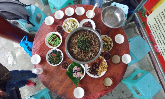喝罷三碗阿姐手中的米酒,這滿(mǎn)桌的美食就等著動(dòng)箸了。長(zhǎng)桌宴席的主菜,即是為了“六月六”祭祀而宰的牛。那一大盆牛肉堆積如山,面上灑滿(mǎn)薄荷,清香四溢,味美量足,一桌人都吃不完。一方面足見(jiàn)布依人民的豪爽,另一方面也許是為了大家相聚的時(shí)間更多,在餐桌上把酒言歡。