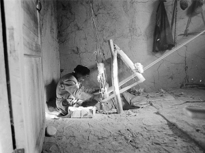 紡線車高約80厘米,寬約60厘米,長約22厘米。紡線車也和切克曼一樣古老,完全靠手工搖,沒有絲毫機(jī)械動力。老人紡線時,右手搖動紡線機(jī),左手慢慢放絨,把比普通棉紗線粗兩三倍的絨線纏繞在錠上。這個工序叫做加捻和卷繞。隨著紗條抽長拉細(xì),纖維變得更加平直,紗條強(qiáng)力下降,容易斷裂或延伸,因此需要加上適當(dāng)捻度使其具有一定的強(qiáng)力。這個過程結(jié)束后,老人起身說:“經(jīng)過加捻和卷繞之后,要用水沖洗,晾干后就可使用了?!?/p>