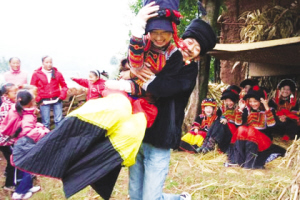 居住在滇西北和滇南等地的彝族也保留著搶婚的習(xí)俗,只是形式稍有不同。在滇西北地區(qū),男方家的人一邊給女方家送彩禮,一邊用氈子強(qiáng)行把姑娘裹走。這時(shí)女方家的人可以用假打的方式對(duì)付來?yè)尰榈娜耍押诤诘腻伝夷ㄔ趽尰檎叩哪樕?。搶婚的人們一個(gè)個(gè)鍋灰滿面,黑不溜秋的,常逗得賓客開懷大笑。在滇南等地,搶婚的地點(diǎn)、時(shí)間都是事先約好的,往往姑娘在田里勞動(dòng)、在村邊割草或背柴回家的路上就被搶走了。搶到的姑娘直接被領(lǐng)到男方家的堂屋。這也標(biāo)志著雙方正式締結(jié)婚姻關(guān)系了。不管用什么形式搶親,把姑娘搶到新郎家后,都要按當(dāng)?shù)匾妥宓牧?xí)俗,舉行婚禮,并宴請(qǐng)賓客。