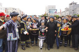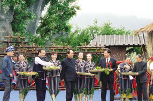 黔西南州領(lǐng)導(dǎo)和望謨縣委書記鄧家富(右三)、縣長(zhǎng)黃興文(前排左三)為望謨縣各族人民和各位來(lái)賓祈福,播撒幸福種