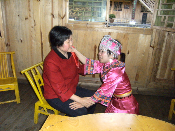 哭嫁歌內(nèi)容有“母女對哭”“嫂妹對哭”“姐妹對哭”“哭離娘席”“哭別祖宗”“哭兄弟”“哭梳頭”“罵媒人”“哭上轎”等,甚至還有同村同齡未婚姑娘的群哭——“哭十姊妹”??藜薷柙从谕良易骞媚锍黾耷暗目藜拗祝绞桥R近婚期,哭聲越悲,甚至通宵達(dá)旦。2010年,“土家族哭嫁歌”已被列入第三批國家級非物質(zhì)文化遺產(chǎn)名錄。