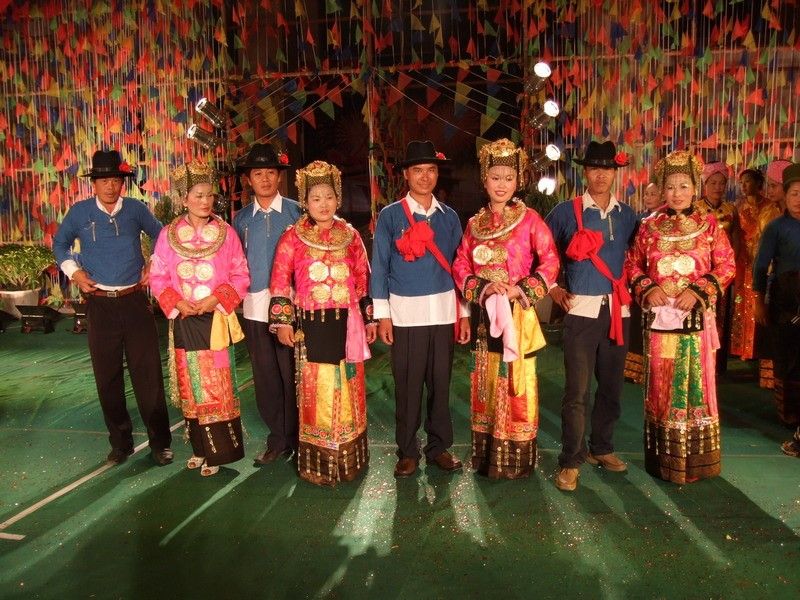 成婚儀式在新娘家舉行,屆時要殺豬、殺雞(有的人家還宰牛),備辦豐盛的酒席宴請親朋好友和本寨父老鄉(xiāng)親。舉行婚禮之日,在新娘家堂屋內設置“茂歡”(直譯為魂桌),擺上一至三張蔑桌,用芭蕉葉鋪面,上擺煮熟的雌雄子雞一對,和用芭蕉葉盛裝的糯米飯以及米酒、舂鹽棒、食鹽、芭蕉、紅布、白布、白線等物。雌雄子雞需用傣語稱為“索累東”的芭蕉葉做成的葉帽罩蓋。作好舉行婚禮的準備后,新娘的女友,要陪伴新娘梳洗打扮,等待新郎登門。新郎亦在家中梳洗更衣,在親朋好友陪同下,到新娘的竹樓上舉行結婚儀式。