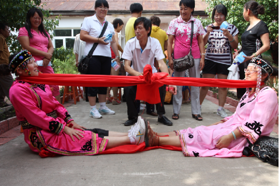 鄂倫春族特別喜歡體育活動,每當狩獵閑暇的時候,便會開展各項體育比賽活動。兩三個人在一塊平地上,拿出一根皮繩就可以進行跳繩比賽;在河邊撿起石頭就可以進行投擲比賽;跳到河里又可以進行游泳比賽。他們也很樂于進行力的較量,摔跤,鄂倫春語稱“娟滴任”,這是獵人們普遍喜愛的一項運動,常勝者會贏得人們的贊賞和姑娘的青睞。還有一種較力比賽,鄂倫春語稱“譚滴任”,俗稱“拽棍”。兩人相對坐在地上,雙手緊握一根約半米長的木棍,雙腳平伸雙足相抵。比賽開始,雙方拼力拽拉木棍,將對方拉起來為勝。