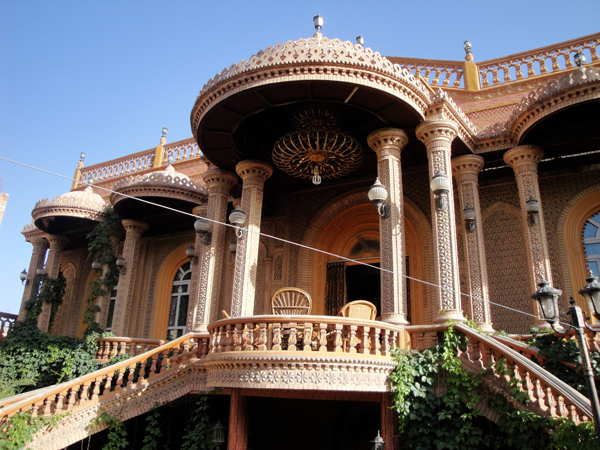 維吾爾族的建筑物有其獨(dú)特風(fēng)格。房屋方形,有較深的前廊;室內(nèi)鑿壁龕,并飾以各種花紋圖案。舊式房屋多系土木結(jié)構(gòu),窗子較小,房頂開(kāi)一個(gè)窗,通風(fēng)采光差;室內(nèi)進(jìn)門(mén)有一連灶土炕,用來(lái)做飯取暖。平房一般比較講究寬敞明亮通風(fēng)。廳室布置整潔樸雅,四壁呈白色泛藍(lán),掛的壁毯,靠墻置床,被褥均展鋪于床罩或毛毯之下,床上只擺設(shè)一對(duì)鏤花方枕。室中央置長(zhǎng)桌或圓桌,家具及陳設(shè)品多遮蓋有鉤花圖案的裝飾巾,門(mén)窗掛絲絨或綢類(lèi)的落地式垂簾,并襯飾網(wǎng)眼針織品。地面多裝飾民族圖案。維吾爾族人喜歡在庭院中種植花卉、果樹(shù)和葡萄,整個(gè)環(huán)境顯得雅靜、清新。