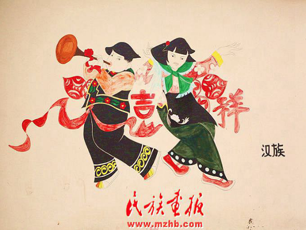 村中圍墻上畫有介紹56個(gè)民族的特色壁畫