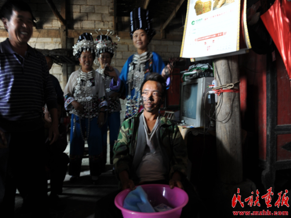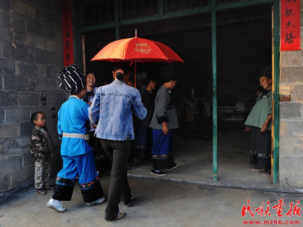 姑娘出嫁必須有娘家人陪送,婚禮這一天清早,“新娘”便在“接親客”的帶領(lǐng)和送親隊伍的陪同下,一路歡聲笑語 ,浩浩蕩蕩向“新郎”家走來。走到新郎家村邊,有的燃放鞭炮,一直燃放到新郎家門口,請新郎父母出來開門;無鞭炮準備的,則在寨邊稍候,由迎親伙伴飛報新郎家做好迎親的準備。男方父母聽到后,多數(shù)是很高興地喊醒家中兒女,由新郎的妹妹或堂姐妹為迎親主體,加上寨上的姐妹和房族組成迎親隊伍,打開大門,把新娘迎進家來。接親的主要儀式是接傘。接傘的人必須是新郎的小妹或堂妹。無親妹、堂妹者則由新郎父母指定一與新郎同輩份的小姑娘去接。新娘走至大門,即由新郎的妹妹跨出門外迎接新嫂子,新嫂子接著用左手把雨傘遞給接傘的妹妹,接傘妹妹接過新嫂子手中的雨傘后,新娘即用左腳跨進屋內(nèi),以示今后成為新家庭的主婦。隨即由接傘妹妹攜新娘手迎入新房,迎親婦女們陸續(xù)進入新房休息。入門后,新郎家的“陪娘”及姑娘們便熱情地安排“送親客”團團圍坐,并簇擁著“新娘”緊靠堂屋中柱子就坐,意為“新娘”從此當(dāng)家立業(yè),將來就像中柱子一樣,頂大梁,撐起這個家。