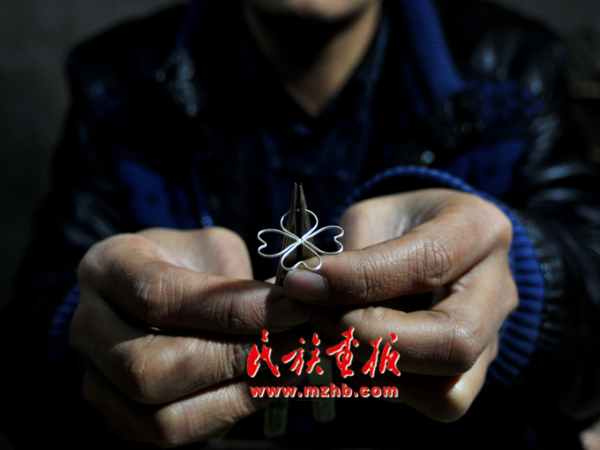 苗族銀飾鍛造技藝工藝流程大致包括鑄煉、錘打、拉絲、搓絲、掐絲、焊接、編結(jié)、鑲嵌加固、洗滌等。龍?zhí)栐阽Y刻圖案時并沒有任何范本,工藝的精細靠的就是他心中有圖,手中有數(shù)。