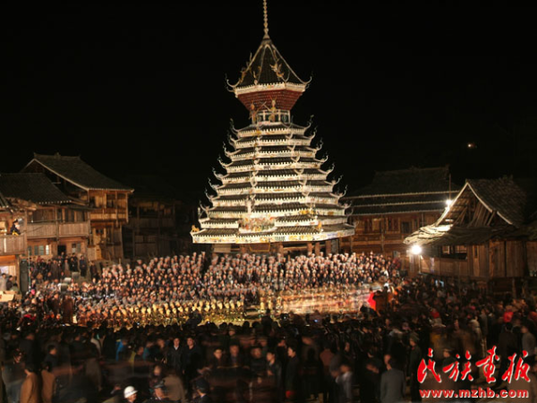 后來(lái),鼓樓功能逐漸擴(kuò)大,不僅有擊鼓報(bào)信,召集族人議事的場(chǎng)所功能,還成為村寨的娛樂(lè)休閑中心。鼓樓在侗語(yǔ)叫“百”,意為“扎堆”、“聚集”。農(nóng)閑時(shí)節(jié)或耕作之余,人們來(lái)到鼓樓下聊天、唱歌、講故事。每逢喜慶節(jié)日,盛裝的侗家人就會(huì)在鼓樓坪歡聚一堂,吹蘆笙、踩歌堂,演侗戲,年輕人甚至利用這個(gè)場(chǎng)所對(duì)歌敘情、談情說(shuō)愛(ài)。正如侗族民歌中所唱“鼓樓是村寨的暖和窩,沒(méi)有鼓樓無(wú)處尋歡樂(lè),高高的杉木豎起鼓樓來(lái),有了聚集的地方有了歡樂(lè)的歌”,這些正是對(duì)鼓樓功能擴(kuò)大的最好佐證。