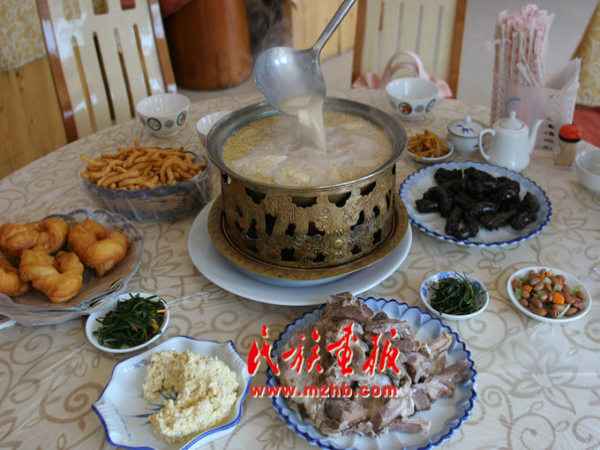 在《蒙古秘史》中有許多蒙古族制作、加工白食的記載。牧民將剩余的奶子加工制作成奶皮、奶豆腐、奶酪等各種便于攜帶和儲(chǔ)存的食品,以滿足日常游牧生活和生產(chǎn)的需求。延伸開(kāi)來(lái),與白食有關(guān)的奶茶、奶酒等都可歸到白食類。“不喝一頓奶茶,牧民便頭疼”是牧民對(duì)白食依賴的真實(shí)寫照。2014年蒙古族奶制品制作技藝入選國(guó)家級(jí)非物質(zhì)文化遺產(chǎn)代表性項(xiàng)目。