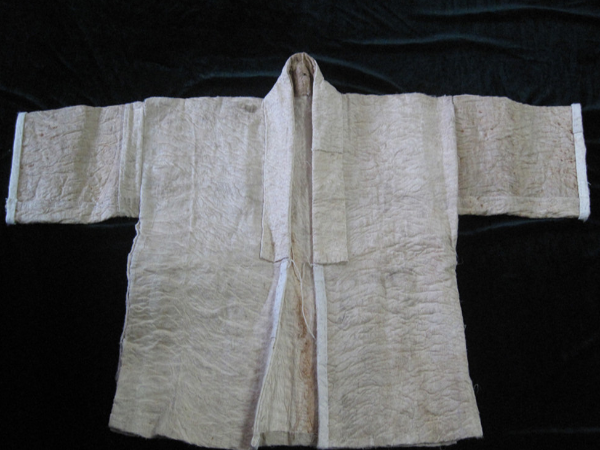 據(jù)了解,制作樹皮布的樹種有厚皮樹、黃九樹、構(gòu)樹(學(xué)名為楮樹)、見血封喉(又稱箭毒木)等,以見血封喉的樹皮加工出來的樹皮布質(zhì)地最好。制作樹皮布的步驟是:第一步:扒樹皮。首先制作能夠敲打和剝離樹皮的工具、選取樹干筆直、不長節(jié)、木質(zhì)較為堅硬的樹木,砍成長40厘米、直徑為5厘米的兩根木棍。一根用刀把一頭削細(xì),用于敲打樹皮;另一跟把一頭削成木楔狀,用于剝離樹皮。根據(jù)需要制作的物件大小,扯一根藤,量一下樹干上方和下方之間的長度,再用鉤刀在樹的上、下方各砍一道記號,然后用木棍在記號的范圍內(nèi)敲打樹皮,使其蓬松,與樹干分離。在敲打的過程中,有經(jīng)驗者通過聆聽木棍敲打在樹干上的聲音,就可以辨別出哪里還沒有敲打夠,于是繼續(xù)敲打該處,直到感覺整個樹皮已經(jīng)與樹干完全分離,這時才用鉤刀在上、下方作記號的地方把樹皮砍一圈,中間用刀豎著劃一道口子,再用特制的木楔棍一點一點地撬樹皮,將樹皮進(jìn)行片狀剝離。第二步:休整。將剝離下來的整塊樹皮壓平,除掉表皮,削掉節(jié)疤,拍打樹皮纖維,使其松動。第三步:漂洗。在水中進(jìn)行搓洗拍打,脫去樹膠,保留軟狀的樹皮纖維。第五步:曬干。將脫膠后洗凈(含有大量水分)的樹皮纖維晾干。第六步:拍打。把曬干的樹皮纖維拍打整平,使樹皮纖維分布均勻,呈片狀,于是制成樹皮布。最后將樹皮布裁剪、縫綴??p制樹皮衣的工序是:先把軟狀的單層樹皮布折成雙層,按人體結(jié)構(gòu)的大小裁剪出領(lǐng)口、袖口,再用自制的麻線縫綴成衣物。