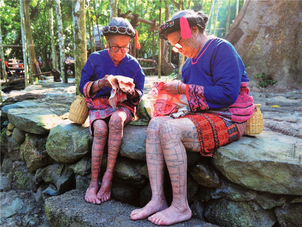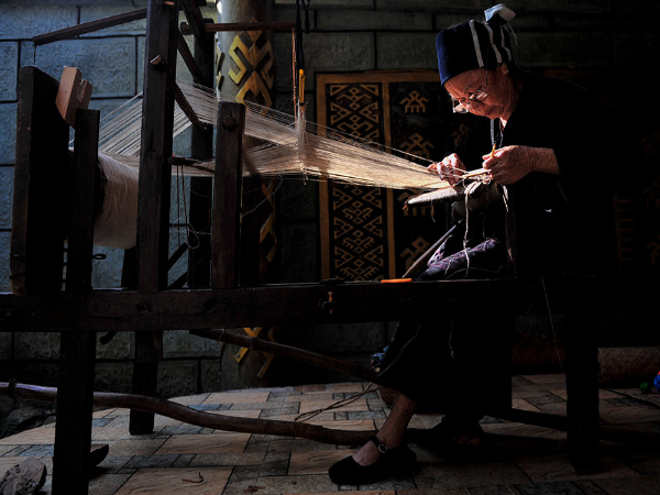 “織”是指使用踞腰織機,采用通經(jīng)斷緯的紡織方法織出各種花紋圖案,在織布時,先手工掛經(jīng),綁住藤或樹皮布腰帶,用腳踩織機的經(jīng)線木棍,席地而坐織布??椈ㄊ怯煤谏蛩{(lán)黑色做底線(經(jīng)線),根據(jù)圖案需要,將各種染色的線搭配,拉經(jīng)線、投緯線(彩色線),用木刀打緊緯線,織出各種花紋圖案。