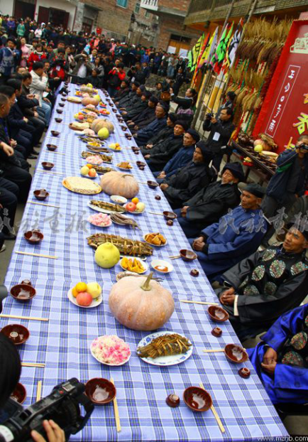 水族以大米為主食,喜愛(ài)糯食,此外,水族還種植一些小麥、包谷、小米、紅稗、紅薯及飯豆等雜糧作輔助糧。糯米飯是節(jié)慶主食,也用于祭祀,故又戲稱“鬼米”。水果有李、橙、橘、桃、梨和楊梅,還出產(chǎn)麥冬、杜仲等各種藥材。水族農(nóng)民不善種菜,因而蔬菜品種比較單調(diào),青菜、廣菜及大葉韭菜是最常見(jiàn)的蔬菜。水族比較重視養(yǎng)殖業(yè)和漁業(yè)。水族酸湯極有特色,有辣酸、毛辣酸、魚(yú)酸、臭酸等多種。極少有炒菜,一年四季都吃酸湯“火鍋”。即使偶有豆腐、肉或魚(yú),也習(xí)慣加入菜中,煮成一鍋沾蘸水吃。吳茂釗《水族食俗點(diǎn)滴》一文指出,輪流坐莊就是熱情好客的文化表露。水族宴席上以雞、鴨、豬頭為尊,特別喜歡吃魚(yú)。水族特色飲食還包括水族特制的豬頭、豬腿、雞、鴨腿、糯米飯、粽粑、魚(yú)包韭菜、煮活魚(yú)等美食。對(duì)于水族人民而言,“吸煙重于喝茶,飲酒重于吃肉”。水族婚、喪、壽宴簡(jiǎn)易,有“吃酸”的習(xí)俗(圖為水族節(jié)日盛宴。席間的“魚(yú)包韭菜”是祭祖儀式的必備之菜。引自民族畫(huà)報(bào))。