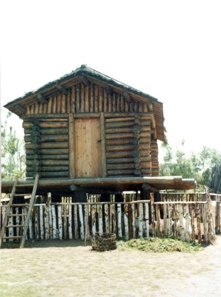 早期,每一個(gè)家族公社都有一個(gè)公用的高腳倉(cāng)庫(kù),鄂倫春語(yǔ)叫“歐倫”,一般是在游獵的中心地帶,選擇四棵自然生長(zhǎng)、成對(duì)角的樹,在距地面約3—4米高的地方留一個(gè)樹杈,砍掉其余的樹頭,樹杈上架兩根直樹干,樹干上面一根挨一根地平鋪木桿成為底座,底座上用木桿壘一個(gè)“木刻楞”小房或用樹枝做一個(gè)半圓形的架子,覆蓋樺樹皮,然后用藤條或樹皮綁縛固定。一側(cè)留有進(jìn)出的小門,借助木梯上下,為防止野獸攀上糟蹋東西,平時(shí)都把木梯放倒在一邊。這種倉(cāng)庫(kù)主要存放一些暫時(shí)吃不了和用不著的食品和雜物,搬遷時(shí)不拆除,里面的東西也不帶走,什么時(shí)候需要再騎馬來(lái)取。個(gè)體小家庭獨(dú)立以后,公共庫(kù)房變成了私家財(cái)產(chǎn)。雖說(shuō)是私家財(cái)產(chǎn),卻從不留人看守,也不上鎖。獵人在外打獵,如果一時(shí)斷糧,可以不經(jīng)主人允許,隨便到任何一家的“歐倫”中拿走所需要的東西,事后向主人通告一聲即可,以后有了如數(shù)奉還,不還主人也不索要。