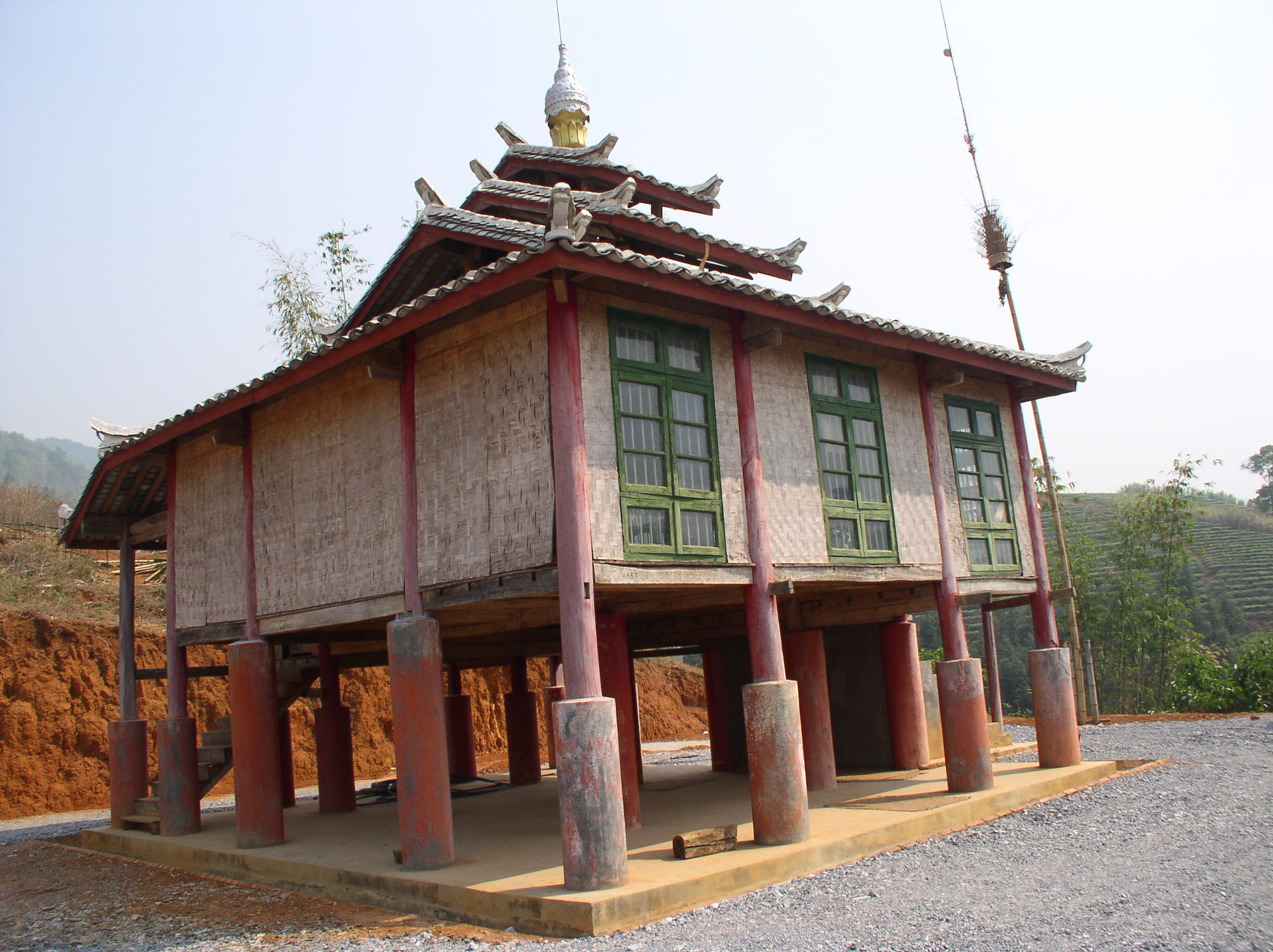 德昂族的家庭民居多為竹木結(jié)構(gòu)、歇山式草頂?shù)母蓹诮ㄖ?,平面有長(zhǎng)方形、半圓形、弧形等多種風(fēng)格。干欄式民居分上下兩層,上層住人、下層作畜廄,有主副兩座樓梯。歇山式草頂為圓弧形的民居,當(dāng)?shù)胤Q“氈帽形”,風(fēng)格粗獷。民居構(gòu)架為穿斗式木梁柱,樓面、隔間均用竹片或木板鋪設(shè)。在德宏等地是一家一院,主房樓上住人、煮食、貯藏糧食,樓下關(guān)牲口;附房用作堆放柴草和安裝舂米用的腳碓。鎮(zhèn)康地區(qū)若干小家庭同住一幢房子,房?jī)?nèi)中間有寬敞的走道,兩旁為各小家庭住室,間壁而居,各有火塘,所以竹樓較大,有的占地近400平方米。20世紀(jì)50年代以后,這種竹樓建筑已有改變,現(xiàn)在部分德昂族的住宅與附近漢族的平房一樣。德昂族信仰佛教,有些村莊里建有寺廟,每逢佛事活動(dòng)人們就來(lái)到寺廟里,舉行隆重的儀式。