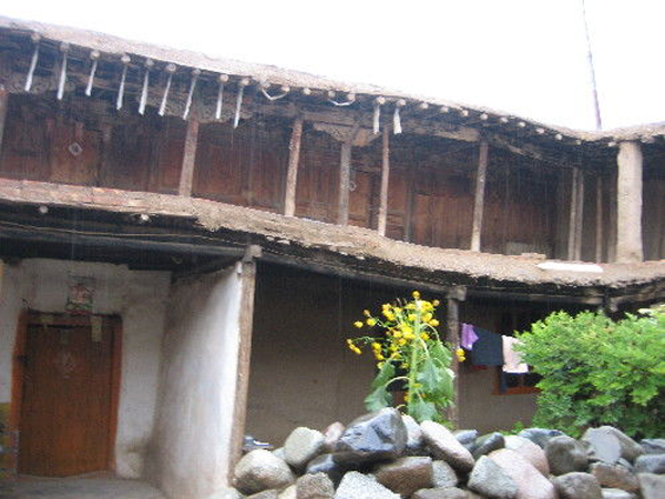 為改善狹小的寨內(nèi)空間,當(dāng)?shù)鼐用窬藿硕幽窘Y(jié)構(gòu)樓房,和青海鄉(xiāng)村民居庭院寬敞的特點(diǎn)形成了反差。寨內(nèi)民居庭院多為四合院式,房屋為土木結(jié)構(gòu)平頂房,一般民居都有飛椽花藻之類(lèi)。屋內(nèi)一般以木板作隔扇,室內(nèi)有護(hù)炕木板、護(hù)墻木板墻圍,且多雕花草于其上。房屋一般面闊三間,正面以木板隔墻并裝上木板條方格小花窗。佛堂設(shè)在二樓,佛堂所在的房屋一般都是上房,和佛堂不同向的兩邊廂房一般做臥室。院落中央一般都有豎掛經(jīng)幡的旗桿,還設(shè)有桑臺(tái),具有明顯的藏式特點(diǎn)。