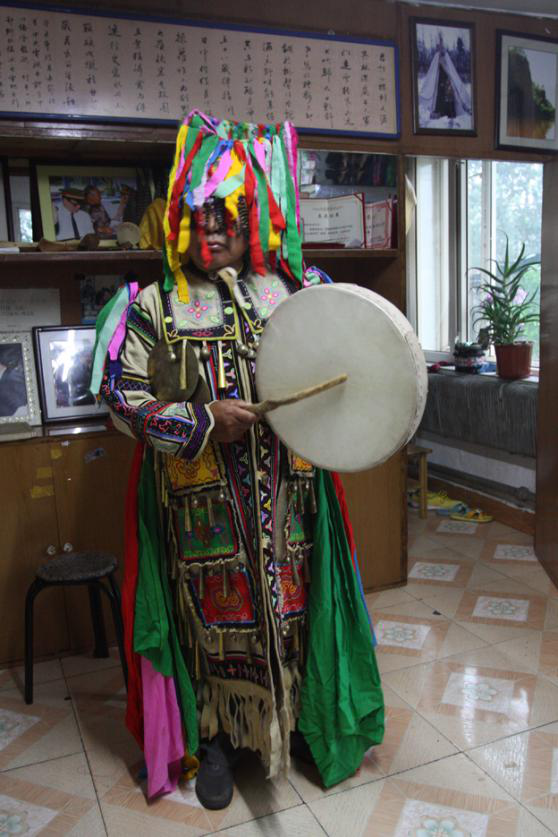 冬天穿的鞋是“奇哈密”和“溫得”,“奇哈密”是用狍脖皮或犴皮做靴底,用狍腿皮拼縫成靿的短靴?!皽氐谩笔怯寐够蜥砥ぷ龅祝够蜥硗绕て纯p成靿的長靴。“溫得”因為靿高,冬天穿著打獵不易灌雪。這兩種靴子都要用冬季絨毛狍皮做成的襪子配套穿用,暖和跟腳,踩在雪地上沒有聲響。夏天一般穿“奧勞其”,是一種皮底布靿短靴?!翱己袈洹?,是用冬季絨毛狍皮縫制的二指手套,掌面腕部留一縫口,手從縫口中伸出,手套仍護在手背上,既使在零下40度的嚴寒中處理獵物,也不用擔心手被凍壞。還有一種五指狍皮手套,背面正中繡花、蝶等中心圖案,五指的關節(jié)和指甲處繡出各種小型圖案,然后用連理枝將中心圖案和關節(jié)、指甲圖案連為一體,中心圖案代表手掌,手指圖案代表關節(jié)和指甲,連理枝代表骨骼和血脈(圖為越來越鮮見的薩滿服飾,吳雅芝供圖)。