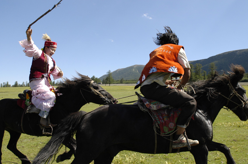 姑娘追是哈薩克族非常喜愛的一項(xiàng)傳統(tǒng)游戲,尤其是男女青年。一般凡是年齡相近的同輩人均可參加游戲。姑娘追的過程中,往往是先選擇一個(gè)眾人目所能及的位置,參加游戲的男女騎手在前往指定位置的過程中,男子可以隨意向女子說俏皮話、開玩笑,按游戲的規(guī)則,此時(shí)男子怎么和女子開玩笑都不算為過。