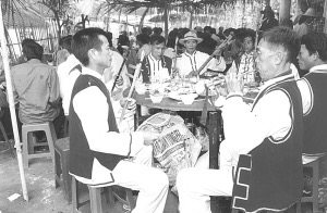 接著婚宴開(kāi)始,八音隊(duì)吹奏的樂(lè)曲優(yōu)美動(dòng)聽(tīng),大家喝喜酒祝賀新郎、新娘;同時(shí),男方家的帶娘給女方家人開(kāi)檳榔碗。開(kāi)檳榔碗的順序是女方家人由老到小分別接檳榔碗,意在感謝女方長(zhǎng)輩、親屬對(duì)新娘的養(yǎng)育之恩。