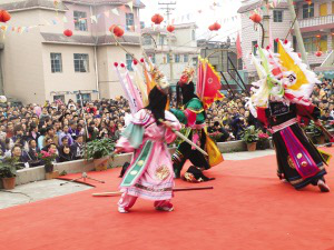在貴陽花溪,地戲可不止大寨一撥?;ㄏ獏^(qū)的地戲共有18撥,也就是各個村寨的地戲隊:花溪大寨、燕樓的思惹、槐州、燕樓村(燕樓村有兩撥)、谷蒙、黨武的當陽、葵林村、新寨、下壩、湖潮的新民、楊梅、寅貢、車田、蘆官、汪官、元方和麥坪的杉木二村。這些地戲隊所演出的劇目都是《薛仁貴征東》、《楊家將》、《羅通掃白》、《三國演義》、《岳飛傳》等歷史故事劇,表演場地方便人們觀看。演者均戴面具,服飾簡單,以鼓擊節(jié)而歌,一人領(lǐng)唱,眾人合之,不用其它樂器伴奏,其風貌近似陽腔。