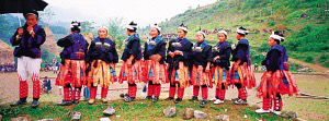 白褲瑤女人身上最惹眼的,除了百褶裙,還有她們衣服背后那一個個大大的方形圖案。傳說900年前,白褲瑤首領有一方皇帝賜給的權印,被女婿以哄孫子為借口,借走并用假印調了包,瑤族人因此被趕進山里,過起了少田缺水的游耕生活。為了告誡子孫不要忘記因為喪失權力而導致苦難的教訓,從此,白褲瑤就在女人的馬鞍衣后面,繡上了一個形狀像首領印一樣的彩色方塊圖案。這是一種紀念,也是一種懷念。裙擺拂過落葉,一如群蝶穿越花叢。