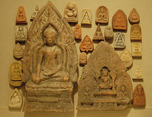 在泰國最北邊的城市清萊的一座古寺里,年長的僧人告訴我,在泰國,帕肯(“泰國擦擦”,泰語為“Phra-Kruang”,這個名詞在標準的泰文詞典里的解釋是:用于避兇消災的小型佛像,作用相當于護身符、祈愿物、供奉物。泰國的Phra-Kruang至今沒有一個公認的中文名稱,既然“擦擦”是譯音,我便挑了兩個最接近泰語Phra-Kruang發(fā)音的字給它:帕肯)的使用方式是這樣的:最早是在修建寺廟的時候放入佛塔內,因為古帕肯的內容全是佛像,經(jīng)過高僧們開光后放入塔內有增加靈氣的作用。百姓通常是到寺廟請回自己需要的帕肯回家供奉,或者作為還愿,出資請寺廟制作一定數(shù)量的帕肯,供奉在寺廟、家中或者贈送親友。